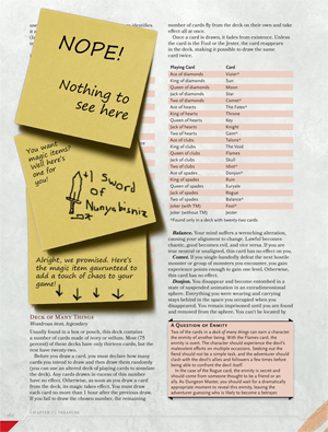 We hit the $25,000 mark, which means time to show off our first DMG preview – the Deck of Many Things. Enjoy the first couple pages for this chaos-making wondrous item, along with our obfuscating notes, and keep up the donations! We’ll see you again at $30,000.